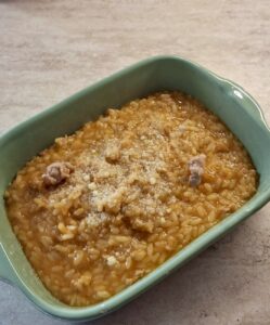 A parte, fate tostare qualche minuto il riso. Aggiungetelo al passato di zucca e portate a cottura (10/12 min massimo), versando il brodo. Una volta finita la cottura, spegnete ed unite il burro. Mescolate il tutto e servite con abbondante formaggio.